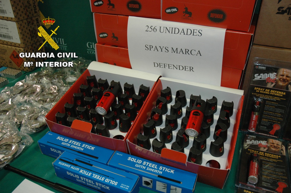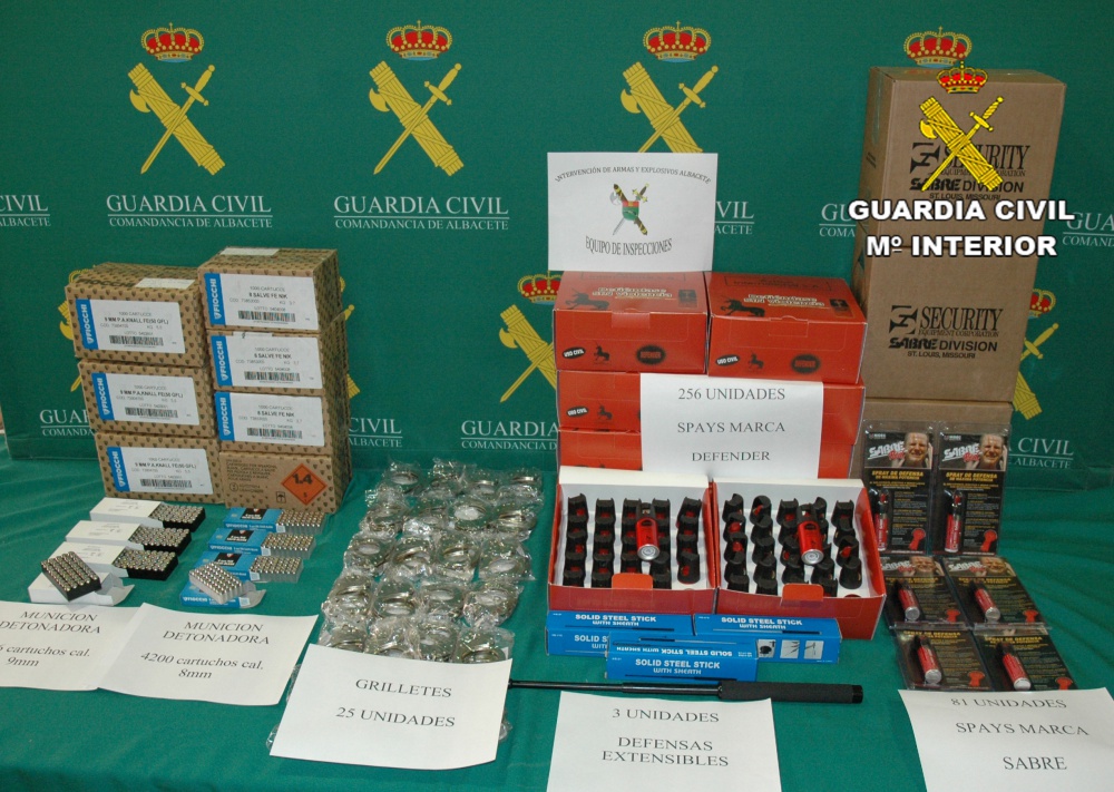 A consecuencia de esta inspección, la Guardia Civil localizó varios objetos para la venta, tanto al público, como a través de internet, entre ellos: 331 sprays de defensa personal, 25 grilletes, 3 defensas policiales extensibles, así como 6.846 cartuchos de fogueo de los calibres 8 y 9 mm.