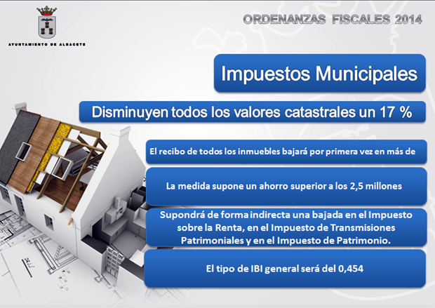 El proyecto de Ordenanzas aprobado, ha continuado, supone la bajada de todos los impuestos municipales y la congelación de las tasas y precios públicos. Además se mantienen todas las bonificaciones fiscales incluidas actualmente en las ordenanzas vigentes. Con respecto a los impuestos municipales, en líneas generales, las modificaciones que se recogen son las siguientes:
