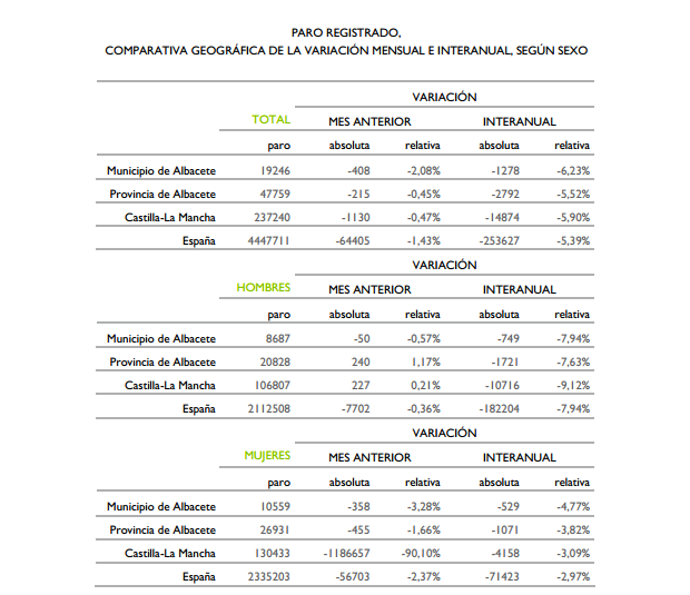 El dato del observatorio de empleo es que a 31 de diciembre de 2.014 tenemos 19.246 parados registrados en el municipio de Albacete, de los cuales 8.687 son hombres y 10.559 son mujeres. Con respecto al mes de noviembre del año 2014, el paro ha descendido en un 2,08% en la ciudad de Albacete, concretamente son 408 personas las que en el mes de diciembre han abandonado las listas del paro con respecto a noviembre.
