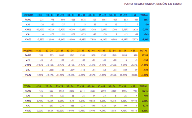 Por franjas de edad, destaca que en estos últimos 12 meses ha caído el paro registrado en la capital un 12,62% en las personas de 20 a 24 años, un 10,53% en las personas de 25 a 29 años, un 14,49% en las personas de 30 a 34 años, un 7,91% en las personas de 35 a 39 años, un 5,49% en la franja de edad de 40 a 44 años, un 4,54% en la franja de edad de 45 a 49 años, un 1,05% entre las personas de 50 a 54 años, en todas estas franjas de edad ha descendido y ha subido un 4,96 entre las personas de 55 a 59 años y en mayores de 59 años que ha subido un 0,11%.