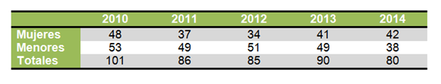 La tasa de ocupación durante 2014 ha sido de 42 mujeres y 38 menores haciendo un total de 80. De estas 42 mujeres: 32 están en Estancia en CUR (urgencias) y 10 en la casa de acogida.