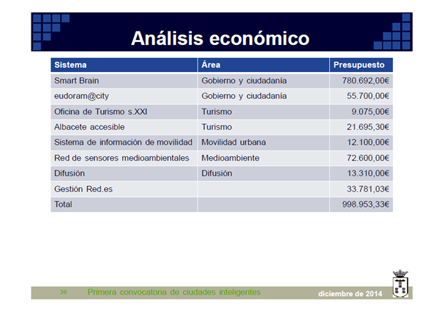 El concejal de Economía y Hacienda, Juan Carlos López Garrido, ha informado en la mañana de hoy del proyecto desarrollado por el Ayuntamiento de Albacete, denominado “Hacia una Ciudad Inteligente” a fin de participar en la “primera convocatoria de ciudades inteligentes de la Agenda Digital” que se convocó el pasado 27 de junio de 2014 a través de la entidad pública Red.es del Ministerio de Industria, Energía y Turismo. Esta convocatoria, orientada a Ayuntamientos de municipios con población mayor de 20.000 habitantes de Andalucía, Castilla-La Mancha y Extremadura, cuenta con una dotación de 3 millones de euros para los municipios de nuestra región y, en concreto, Albacete participa con un proyecto de aproximadamente un millón de euros.