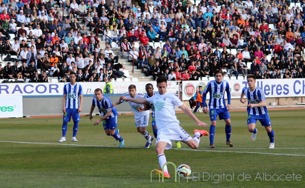 Keko se estaba mostrando como uno de los jugadores más activos del Albacete Balompié y a pesar de estar negado de cara a puerta, el madrileño siempre llevaba peligro cada vez que el esférico caía en sus botas y enfilaba el camino de la portería defendida por Arrizabalaga. Fruto de la insistencia del 12 albacetista, en el 32 de juego lanzó el tiralíneas y Alan Baró frenó en falta dentro del área al menudo jugador blanco y Rubén Cruz inauguró el marcador con su disparo desde el punto de penalti para hacer justicia en el marcador a tenor de lo propuesto por unos y otros sobre el verde del Carlos Belmonte.