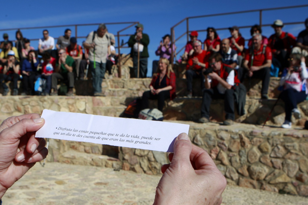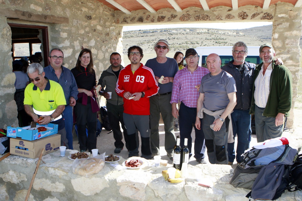 El sol ya se hacía notar y las prendas de abrigo sobraban y más con la subida aunque no muy pronunciada que nos llevaba al “bosque de las palabras al viento” que es un lugar donde hay banderas con frases escritas y está inspirado en la tradición tibetana de colgar mensajes positivos para que el viento difunda sus buenas vibraciones. Un poco más arriba está el mirador de la Sala, un mirador con maravillosas vistas y lugar donde se contempla a la gente que vuela en parapente, ya que hay una pista. Aprovechando la infraestructura y en homenaje al bosque de las palabras, varios de los participantes leyeron distintas frases, que junto al entorno hicieron un rato muy acogedor. Ya desde aquí comenzamos la bajada para dirigirnos a la rambla del agua y a unos doscientos metros a un refugio de excursionistas, una casa de piedra en lo alto de una loma. Aquí hicimos una parada, ya que muy gustosamente el consorcio de la sierra procomunal nos había preparado un almuerzo importante, con cordero, costillas, chorizos,…. a la lumbre, con su correspondiente vino y mistela, todo para coger fuerzas de lo que nos esperaba, una subida bastante pronunciada de unos trescientos metros conocida con el nombre de “La cuesta mata mulas”, y entendimos el por qué de este nombre. Una vez arriba entramos de nuevo en una de las pinadas de la sierra procomunal donde apenas penetra la luz del sol de la cantidad de pinos que hay, fuimos bordeando por lo alto del cerro y admiramos Chinchilla desde otra de sus muchas perspectivas. Tras una pequeña bajada de nuevo subimos y nos dirigimos hacia el famoso “escalón” muy querido por los que practican el deporte de bicicleta de montaña. A partir de aquí descendemos y bajada hasta llegar al punto de partida en la Plaza de santo Domingo, pasamos a visitar el claustro Mudéjar de Santo Domingo (SS. XIV-XV) donde el ayuntamiento de Chinchilla tuvo a bien darnos un refrigerio antes de comenzar la ruta de la muralla.