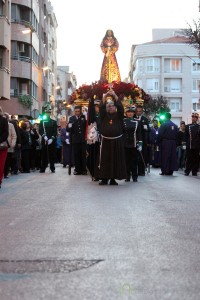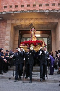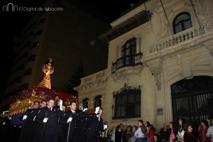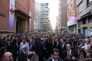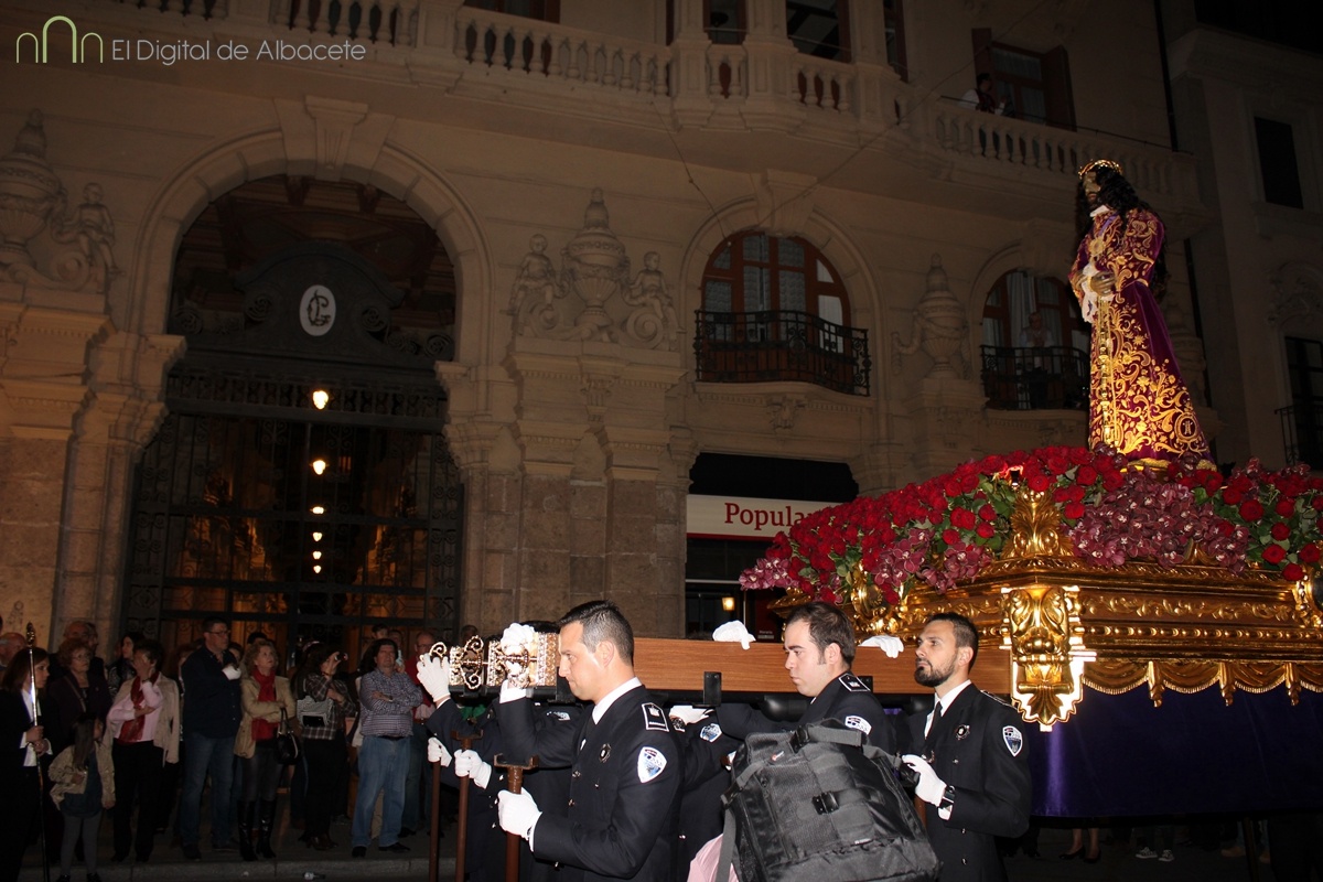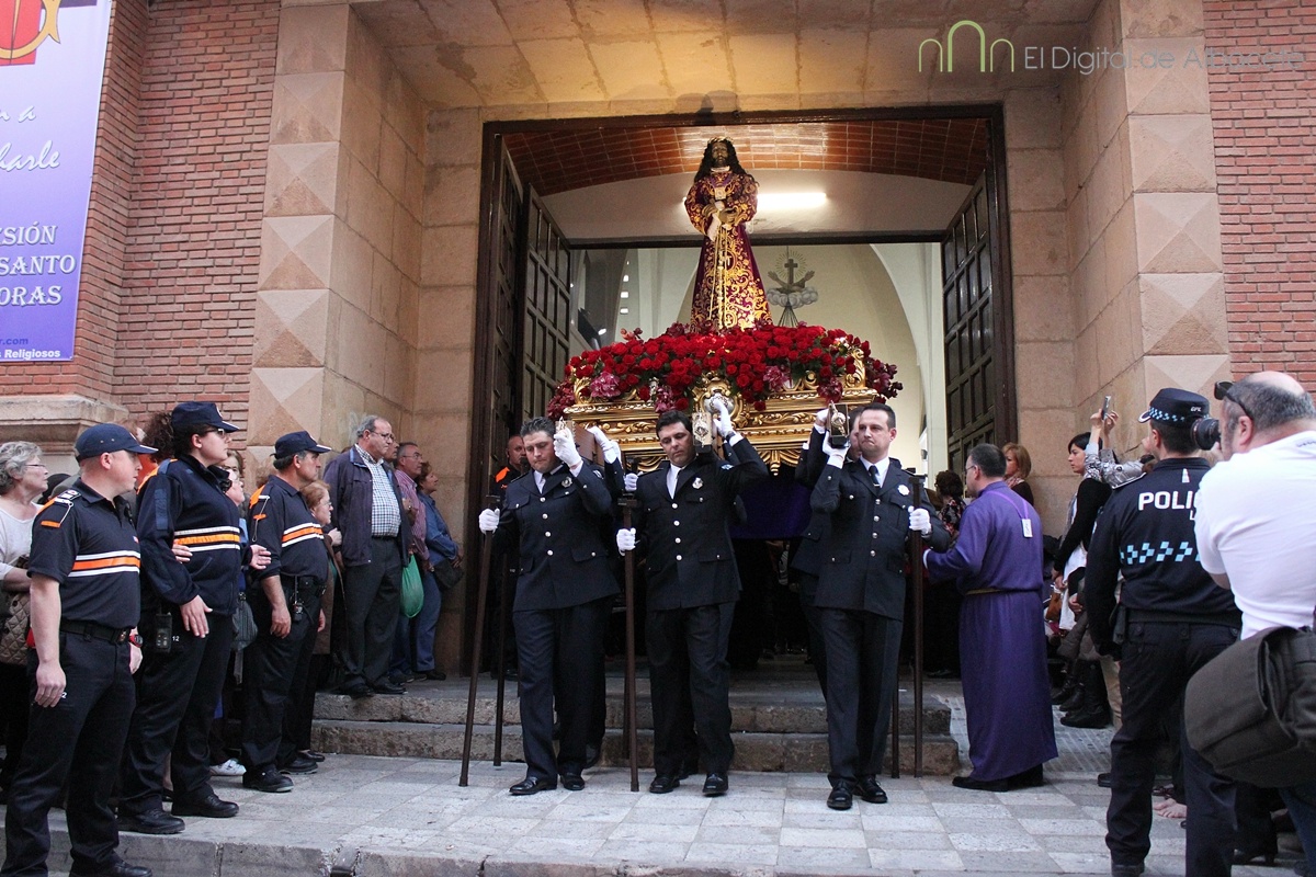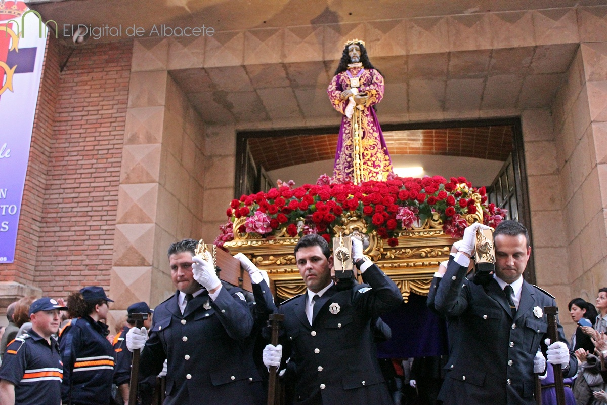 Muy emotiva ha sido la salida de la Parroquia de Franciscanos del Cristo de Medinaceli a hombros de los policías locales. Los asistentes la han aclamado, antes de comenzar la marcha por, Rosario, Antonio Machado, Simón Abril, Plaza de Gabriel Lodares, Tesifonte Gallego, Tinte, Rosario, Franciscanos, el Templo del Cristo de Medinaceli.