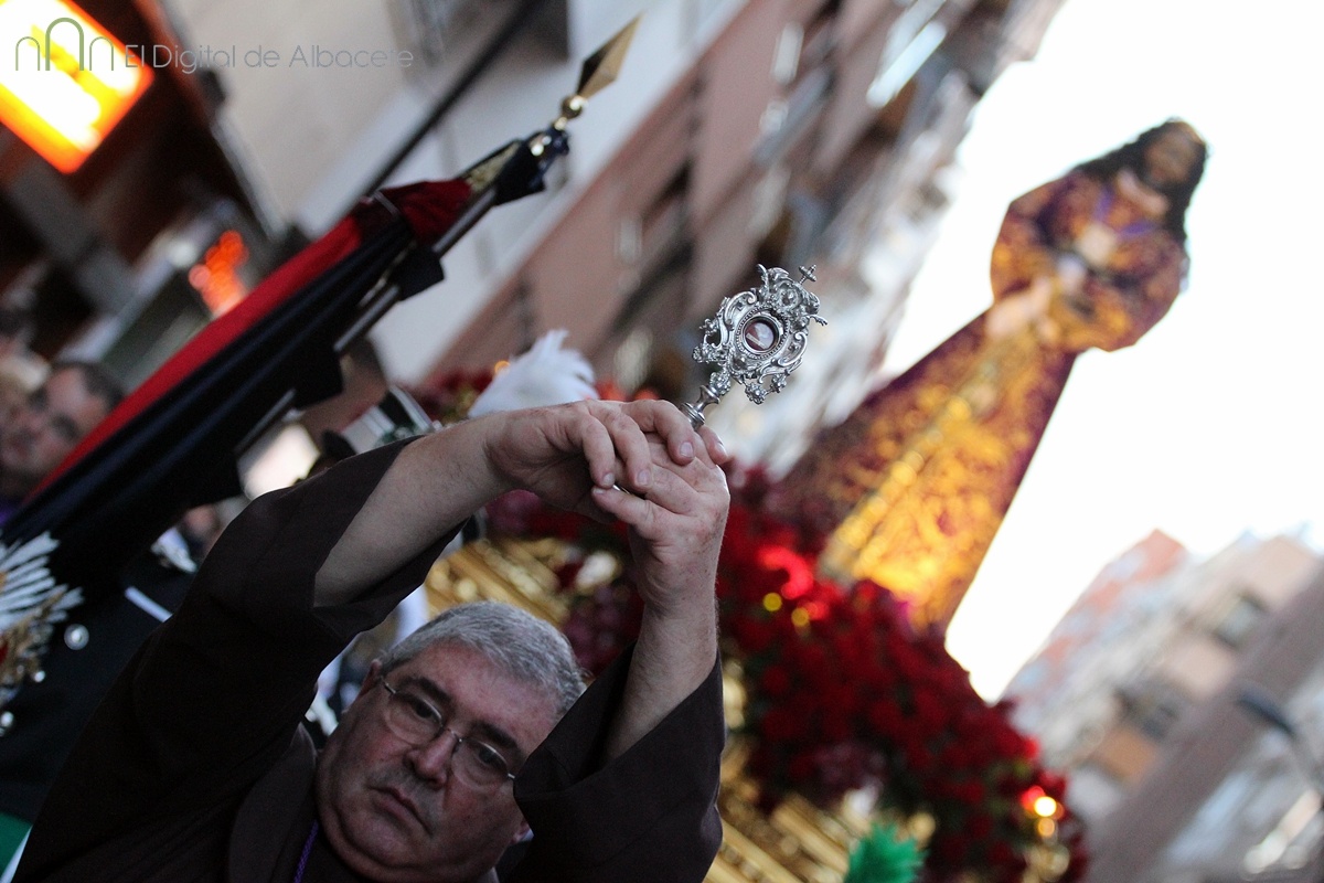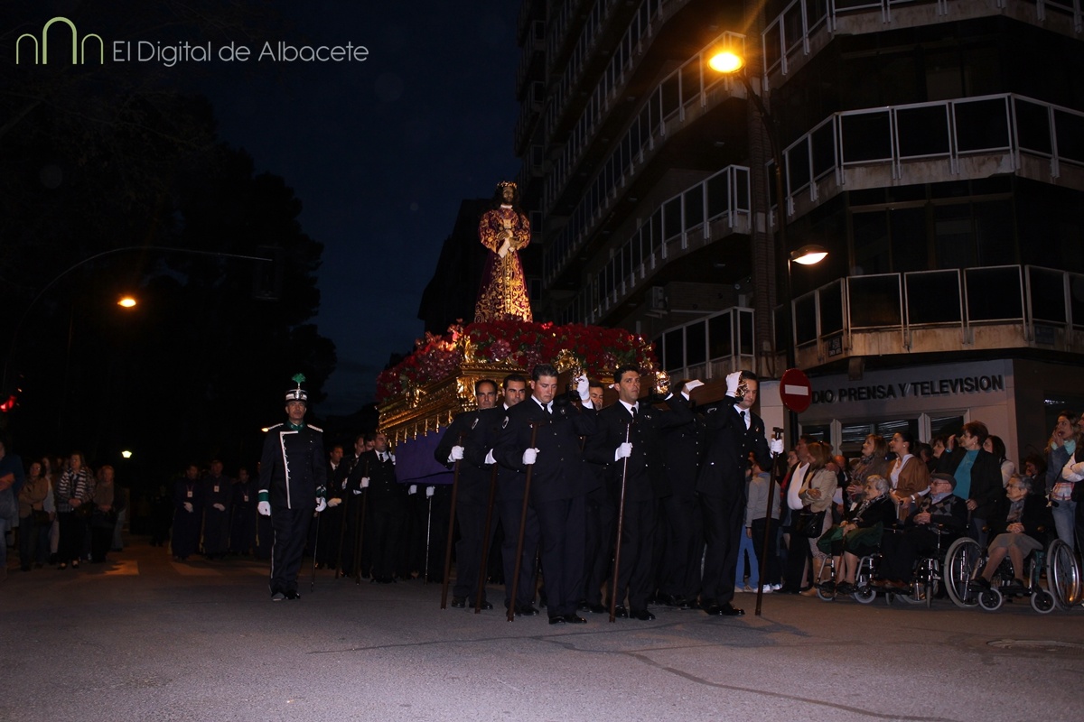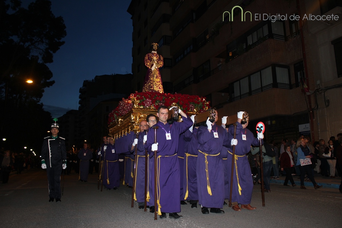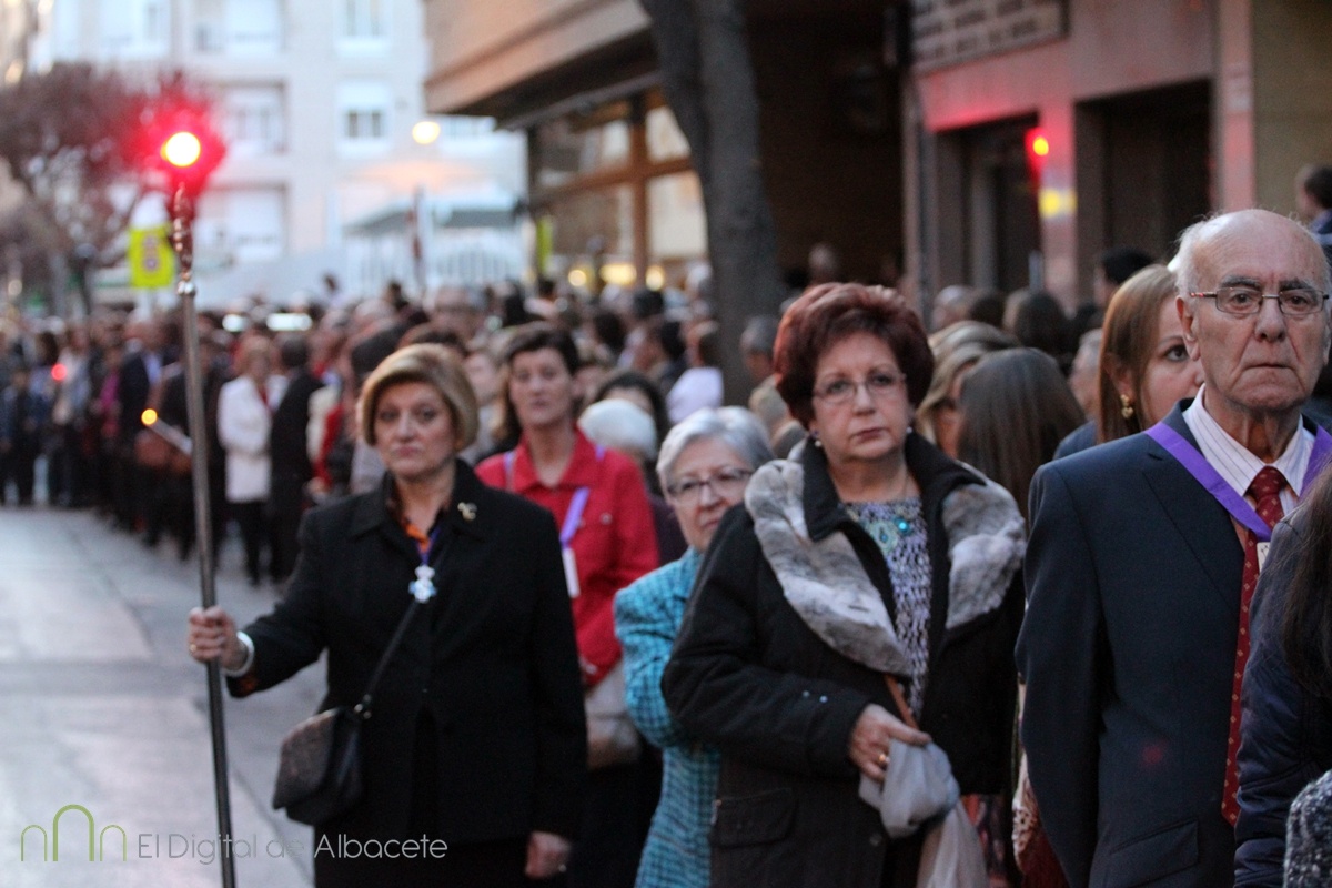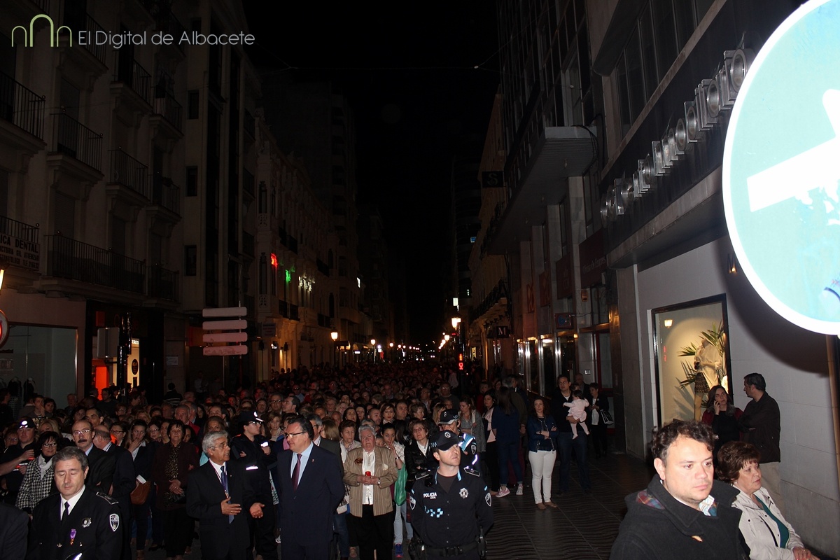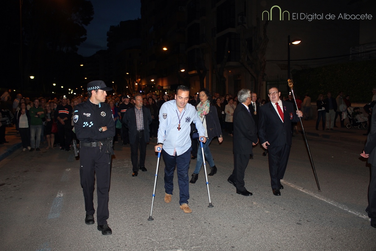 A las 20:00 se ha celebrado este Jueves Santo una de las procesiones más esperadas, cuando el Cristo de Medinaceli ha cruzado las calles de Albacete. Es uno de los Santos con más devotos en la ciudad. De hecho los habituales nazarenos que acompañan a los pasos hoy no eran cofrades, sino fieles albaceteños vestidos de calle, que han desfilado.
