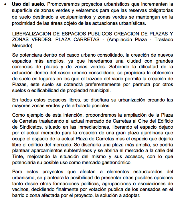 En el programa electoral de la formación no se detalla ni el coste del proyecto, ni la financiación del mismo, así como tampoco se detalla que se haría con la obra actual a la que está siendo sometido este Mercado de Carretas para albergar en su planta baja un espacio de restauración al estilo del “Mercado de San Miguel” en Madrid.