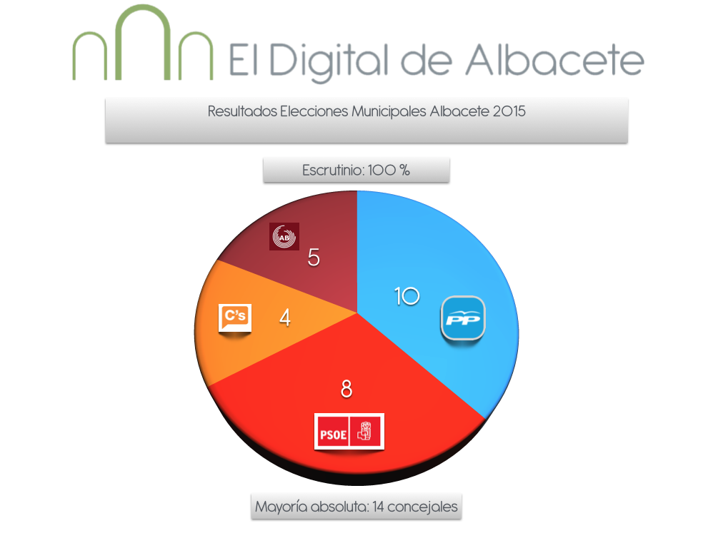Las elecciones municipales en Albacete capital han dejado un Ayuntamiento con cuatro formaciones. El ganador de los comicios ha sido el PP, con 10 concejales, a 4 de la mayoría absoluta. El PSOE ha sido la segunda fuerza más votada, con 8 ediles, Ganemos se hace con la tercera posición y 5 concejales, mientras que Ciudadanos entra en el consistorio con 4 concejales.
