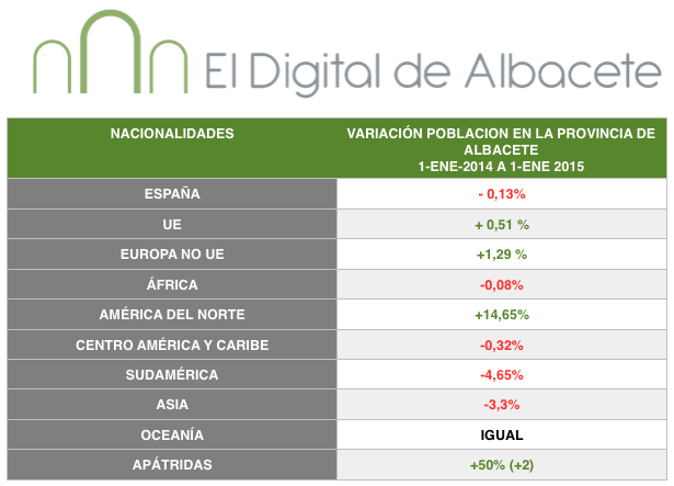 La provincia de Albacete perdió en 2014 casi el 5% de sus residentes sudamericanos y el 3,3% de asiáticos