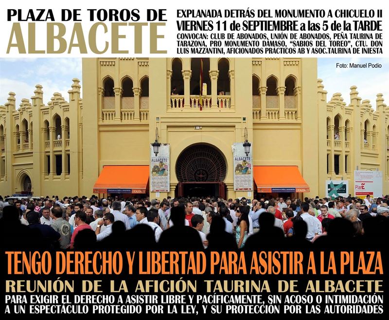 Las principales entidades taurinas de Albacete y su provincia, junto a la Asociación Taurina de Iniesta (Cuenca), se concentrarán el viernes, día 11 de septiembre, a las 17.00 horas, en la plaza de toros de Albacete bajo el lema ‘Tengo derecho y libertad de asistir a la plaza’.
