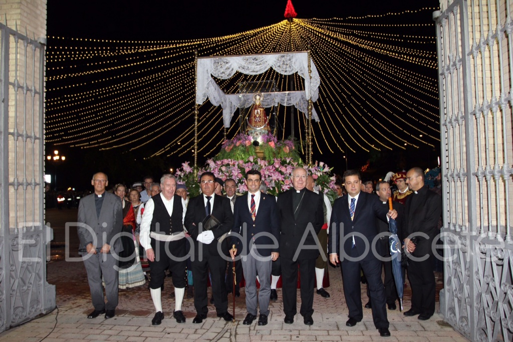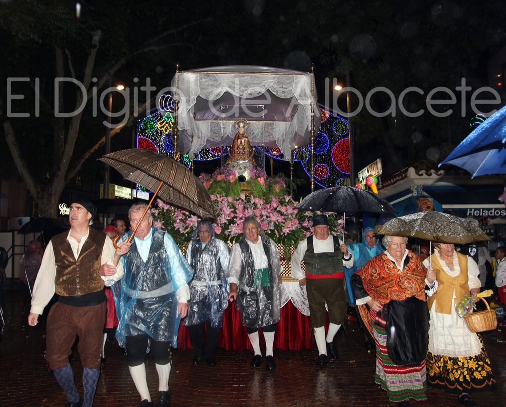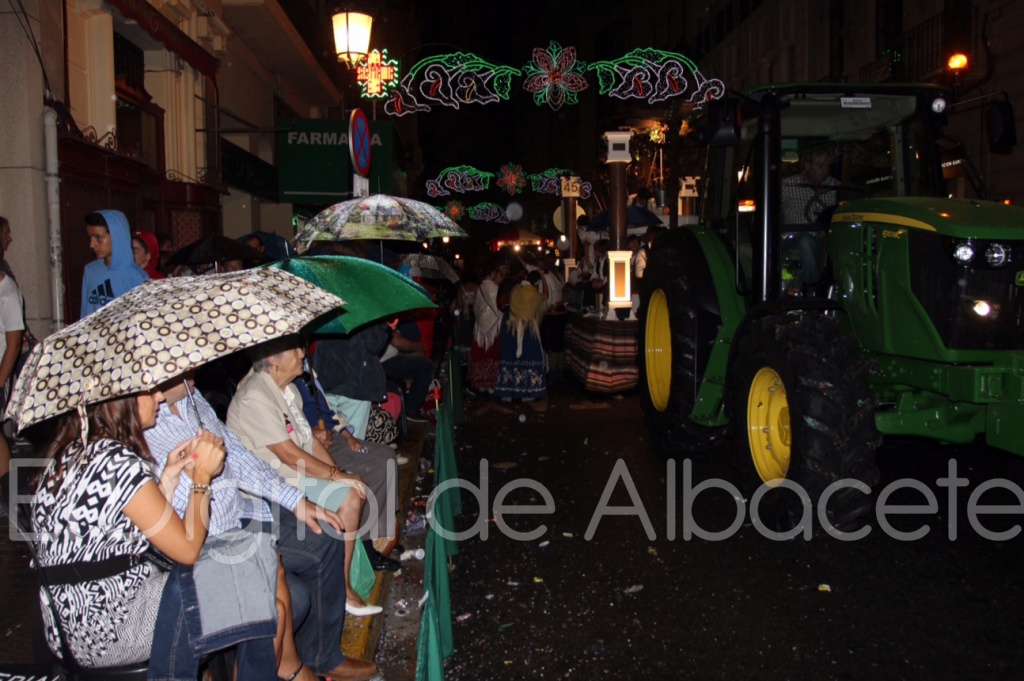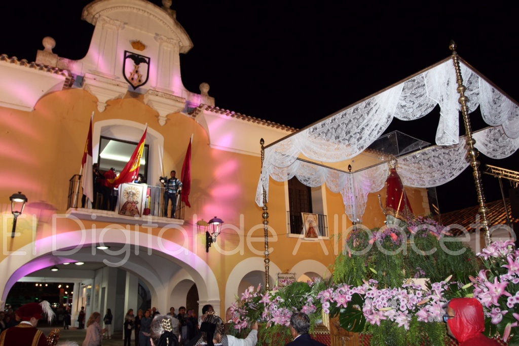 Antes, a las 21.35 horas, llegaba la carroza cubierta con la Virgen, para dar paso a un impresionante espectáculo pirotécnico de luces y sonido que anunciaba el comienzo de las fiestas más esperadas de todo el año así como de los bailes y la música que une a la feria con la tradición más manchega.