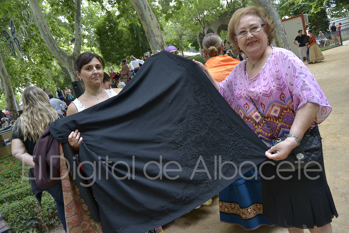 Cientos de albaceteños se han acercado esta mañana de sábado hasta el Parque de los Jardinillos de Albacete, en plena Feria, para contemplar el primer desfile de ‘Exaltación del Traje Manchego’. Un total de 50 parejas han ido ataviadas con algunos trajes originarios y otros réplicas exactas de lo que sería el típico traje manchego. Un acto que ha sido organizado por el grupo de folklore ‘Abuela Santa Ana’ y que además de acoger en Feria “por primera vez este acto con el desfile incluido”, explica el director del grupo, Alberto Montesinos, han hecho las delicias de los asistentes al recoger en un especial escenario los bailes y cantos populares, “hemos tenido una acogida maravillosa, ha sido una experiencia muy gratificante y bonita en un acto que lo hemos hecho pensando en el público, para que conozca de primera mano el traje más característico de nuestra zona, que vean los bordados únicos que son típicos de la mancha, así como poder ver las coreografías que más nos caracterizan. Todo ello ha sido un pequeño ejemplo de la realidad que albergaban nuestros pueblos”.