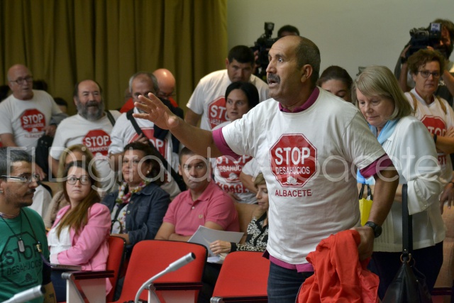 El hecho se ha producido a la finalización de la votación de la moción en materia de desahucios. Entre los asistentes al pleno, uno de los miembros de STOP DESAHUCIOS ha interpelado al Alcalde de Albacete, Javier Cuenca, exponiéndole su situación de inminente desahucio.
