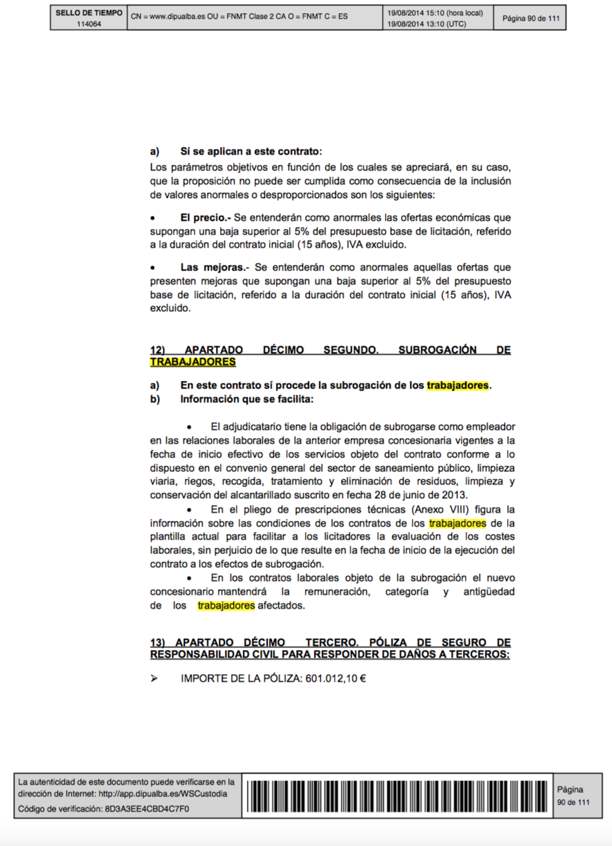 El Digital de Albacete ha consultado en al página web del Ayuntamiento el pliego de condiciones para la adjudicación de Servicio Público de Limpieza Viaria y Recogida de Residuos Municipales en Albacete. El apartado decimosegundo es el que trata la subrogación de los trabajadores en el que se se especifica que “en este contrato sí procede la subrogación de los trabajadores”. Así se puntualiza en tres aspectos, el primero de ellos habla precisamente de la obligatoria subrogación de los trabajadores al decir que “el adjudicatario tiene la obligación de subrogarse como empleador en las relaciones laborales de la anterior empresa concesionaria”. Además, en el mismo se facilita la información de los costes sobre los trabajadores: “información sobre las condiciones de los contratos de los trabajadores de la plantilla actual para facilitar a los licitadores la evaluación de los costes laborales”. Este punto finaliza con la explicación específica de qué aspectos son obligatorios en los contratos de los trabajadores al decir que “en los contratos laborales objeto de la subrogación el nuevo concesionario mantendrá la remuneración, categoría y antigüedad de los trabajadores afectados”.