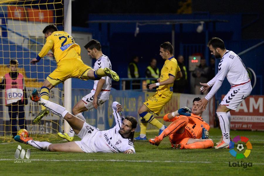 El partido comenzó sin un dominador claro y muy pronto, concretamente en el quince de partido, el técnico local tuvo que variar sus planes tras una dura entrada de Javi Paredes a Álvaro Rey que se saldó con tarjeta amarilla para el primero y la lesión del segundo que dejó su sitio en el verde a Máyor. Pero lo que parecía un hándicap, se convirtió en positivo de un plumazo cuando unos minutos después, Javi Paredes perdió precisamente ante Máyor un balón en el centro del campo y del resto se encargaron David Rodríguez y la pasiva defensa albacetista para que el balón besase las mallas y los locales se pusieran por delante en el marcador en el diecinueve de juego.