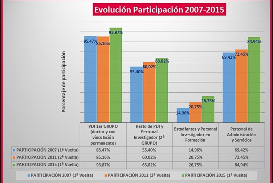 Por sectores, el índice de participación del PDI primer grupo (profesores doctores y con vinculación permanente) ha sido del 93,87%, casi nueve puntos más que en la segunda vuelta de los comicios de 2011; y de un 63,82% en el PDI segundo grupo, frente al 60,02% de hace cuatro años. La participación de los estudiantes y personal de investigación en formación y del Personal de Administración (PAS) en las recientes elecciones ha sido del 26,75% y del 84,94%, respectivamente, frente al 20,75% y el 72,45% de la segunda vuelta de 2011, por este orden.