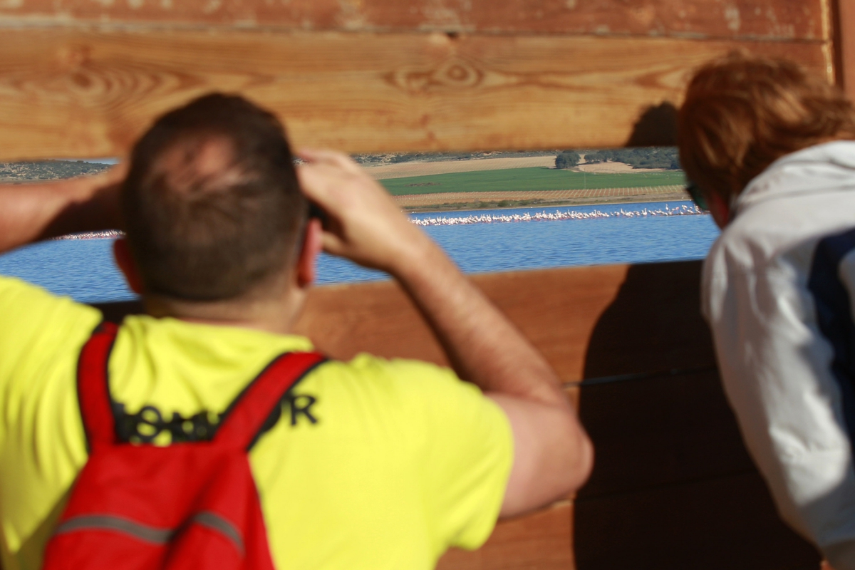 A pocos metros hay una caseta de observación de aves desde donde pudimos disfrutar de una maravillosa vista de la laguna plagada de rosas flamencos, con el verde fondo de los campos, una maravilla y tan cerca de Albacete que debemos conservar.