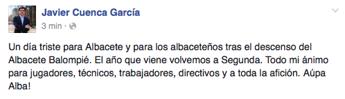 El alcalde de Albacete, Javier Cuenca, ha lanzado un mensaje a través de sus cuentas en las redes sociales tras el descenso matemático del Albacete Balompié.