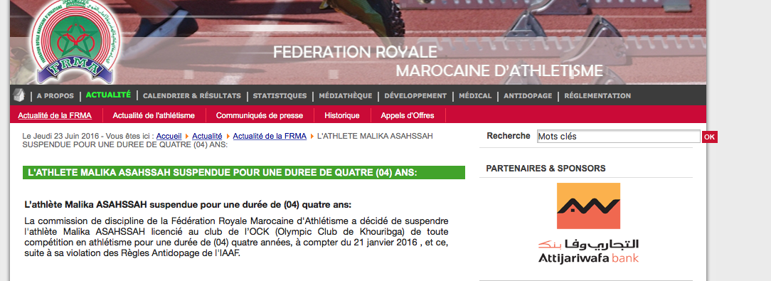 Según informa la Real Federación Marroquí de Atletismo, Malika Asahssah ha sido sancionada por vulnerar las reglas antidopaje de la IAAF. La sanción que le han impuesto es de 4 años, a contar desde el 21 de enero de 2016, tal y como adelanta la página deportiva Wang Connection y refleja la propia federación en su página oficial.