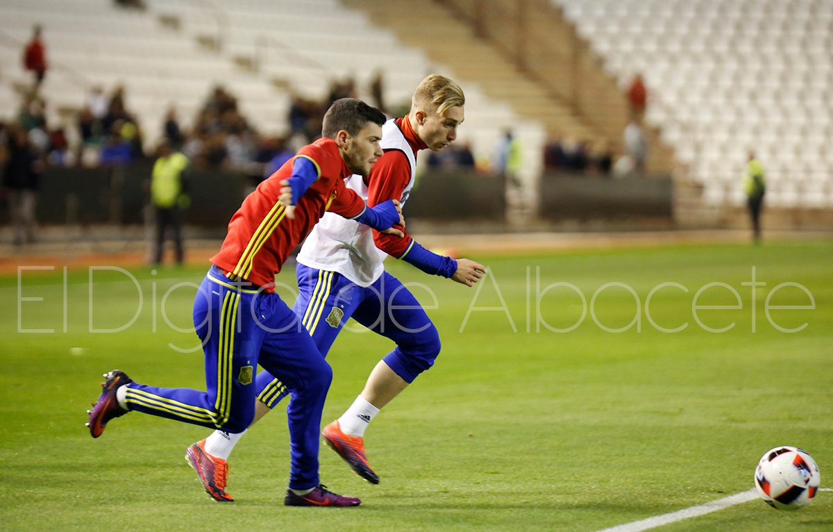 Con un buen número de aficionados presentes en el graderío del Carlos Belmonte que disfrutaron de lo lindo con el combinado nacional, los de Albert Celades pisaron por primera vez el césped donde se decidirá si la selección española sub 21 estará o no en el europeo que este verano se disputa en Polonia y se ejercitaron durante más de sesenta minutos en una sesión de trabajo que discurrió sin problemas ni sobresaltos para la ‘rojita’.
