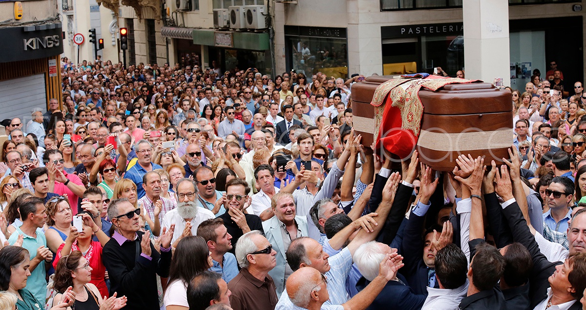 Poco antes de las 12.30 horas y tras dar dos vueltas al ruedo, el féretro con los restos mortales de Dámaso González, ha partido hacia la catedral de ‘San Juan’ acompañado en su recorrido también por vecinos, amigos y familiares, a gritos de «viva Dámaso», «grande» e incluso algún cántico precedido por aplausos.