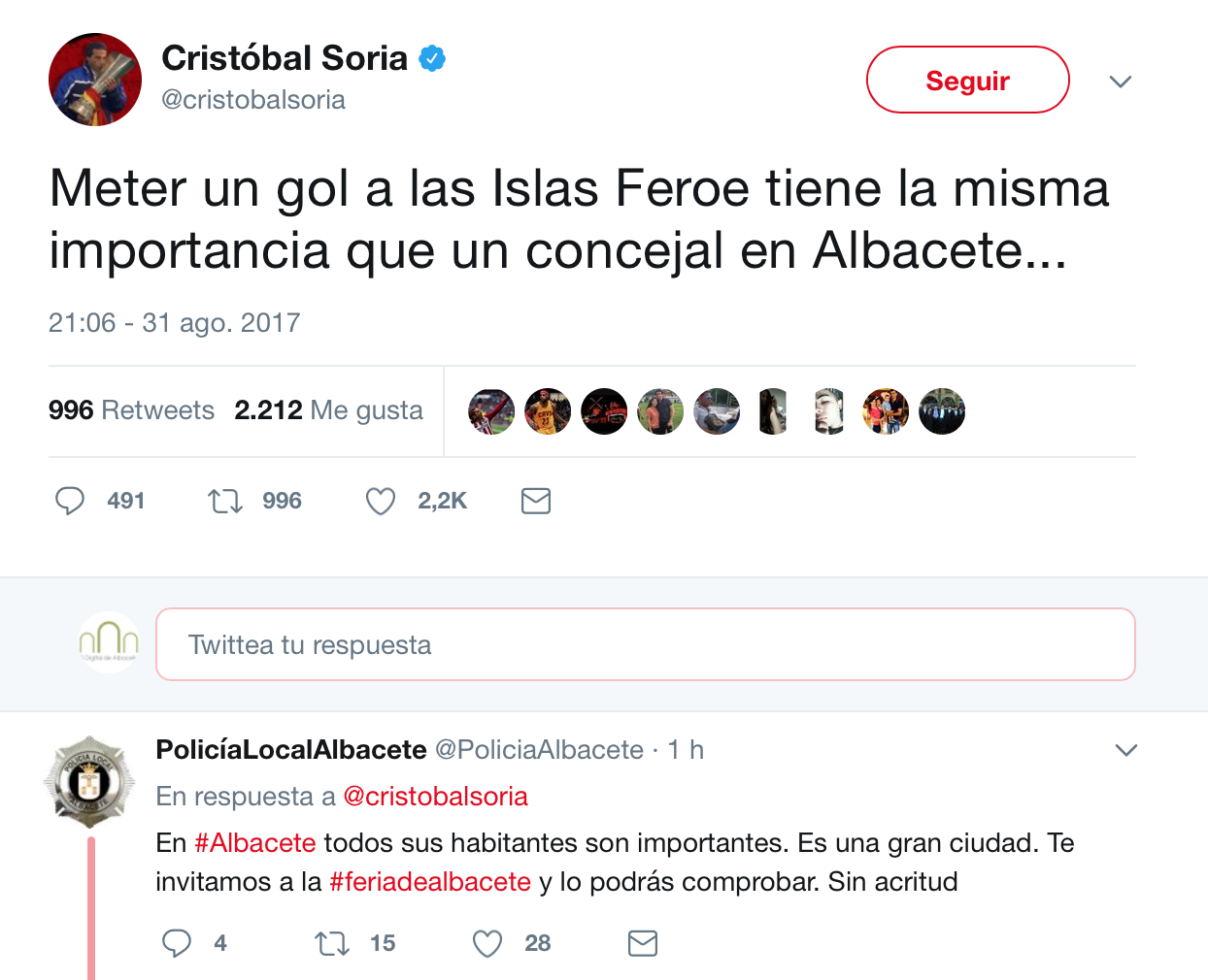 La respuesta ha llegado por parte de la Policía Local de Albacete, que ha contestado al chulesco mensaje de menosprecio a los concejales de Albacete resaltando que todos los habitantes son importantes e invitándolo a la Feria para comprobarlo in-situ.