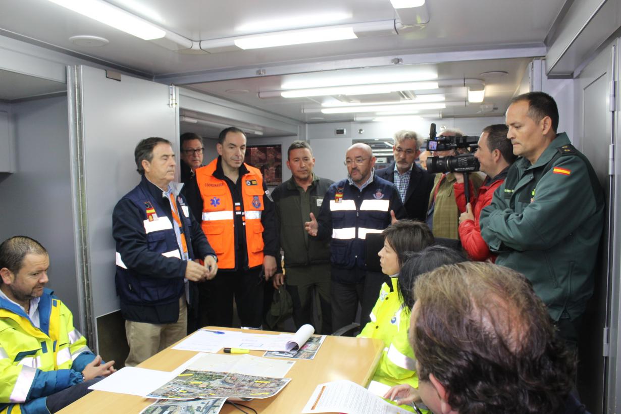 El vehículo de coordinación de la Dirección General de Protección Ciudadana, que ha actuado como Puesto de Mando Avanzado (PMA), se ha instalado dentro de la supuesta zona de alerta, concretamente, en la explanada del aparcamiento junto al Auditorio Francisco Nieva.