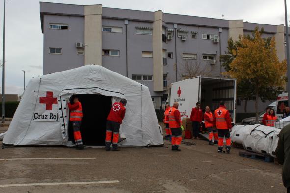 También en las inmediaciones del PMA se ha instalado, por parte de Cruz Roja, un albergue provisional de damnificados, con capacidad para ofrecer atención básica, apoyo sanitario y psicosocial, al que se han evacuado, desde distintos escenarios, a las personas que han colaborado como supuestas afectadas por el simulacro.