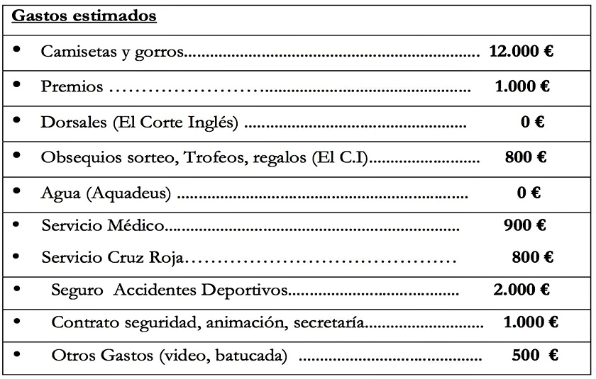 Con el fin de que se disponga de la asistencia sanitaria necesaria para la prueba se ha solicitado la colaboración de Cruz Roja Albacete, asimismo habrá que reforzar con tres médicos colegiados y una UVI móvil, siendo el presupuesto aproximado de unos 900 euros. En este sentido, será contratada una póliza de accidente deportivo a todos los participantes en la prueba, para lo que se solicitará presupuesto a varias empresas aseguradoras, con un precio previsto aproximado entre 0’30 y 0’60 céntimos por participante. La financiación de la prueba se realizará conforme a los presupuestos 2017 del IMD, con un importe total de 19.000 euros.