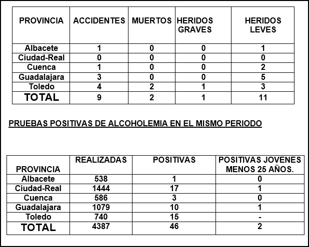 De su parte, en Guadalajara se llevaron a cabo 1.079 pruebas de alcoholemia de las cuales diez dieron resultado positivo, una en menores de 25 años; y en Toledo se practicaron 740 pruebas, de las que 15 fueron positivas, ninguna de ellas en menores.
