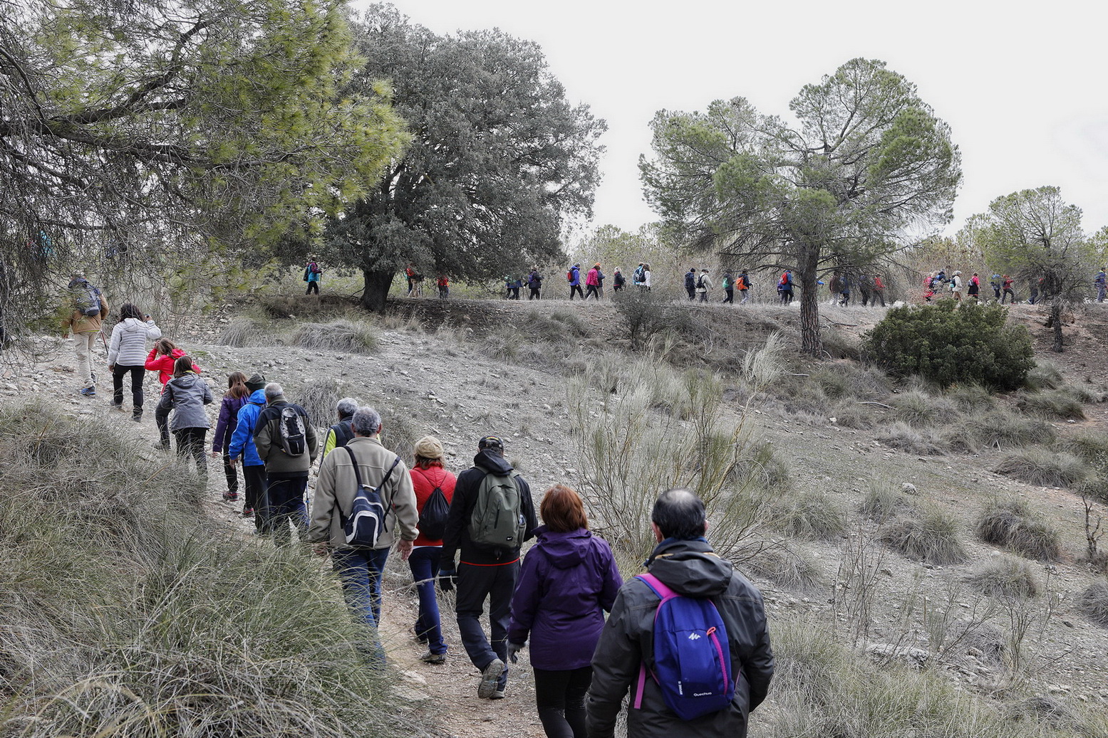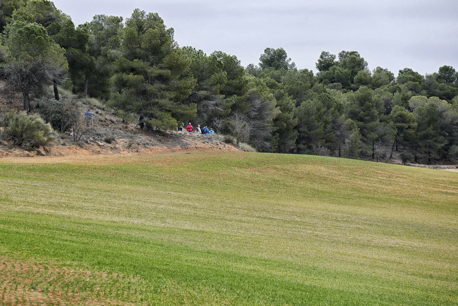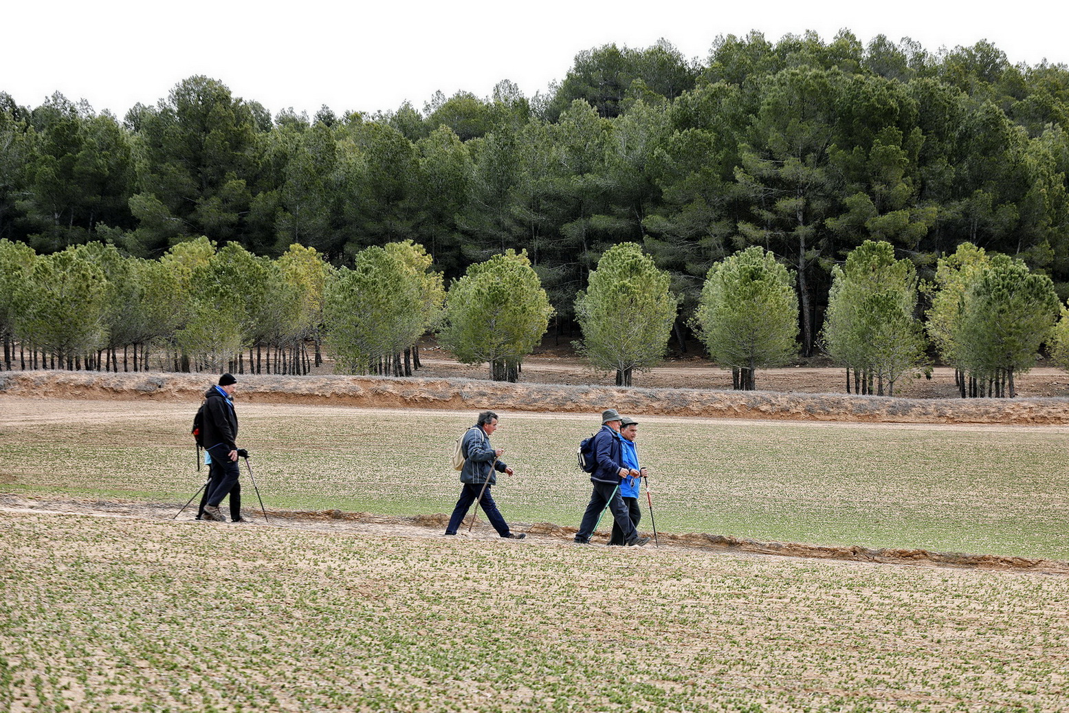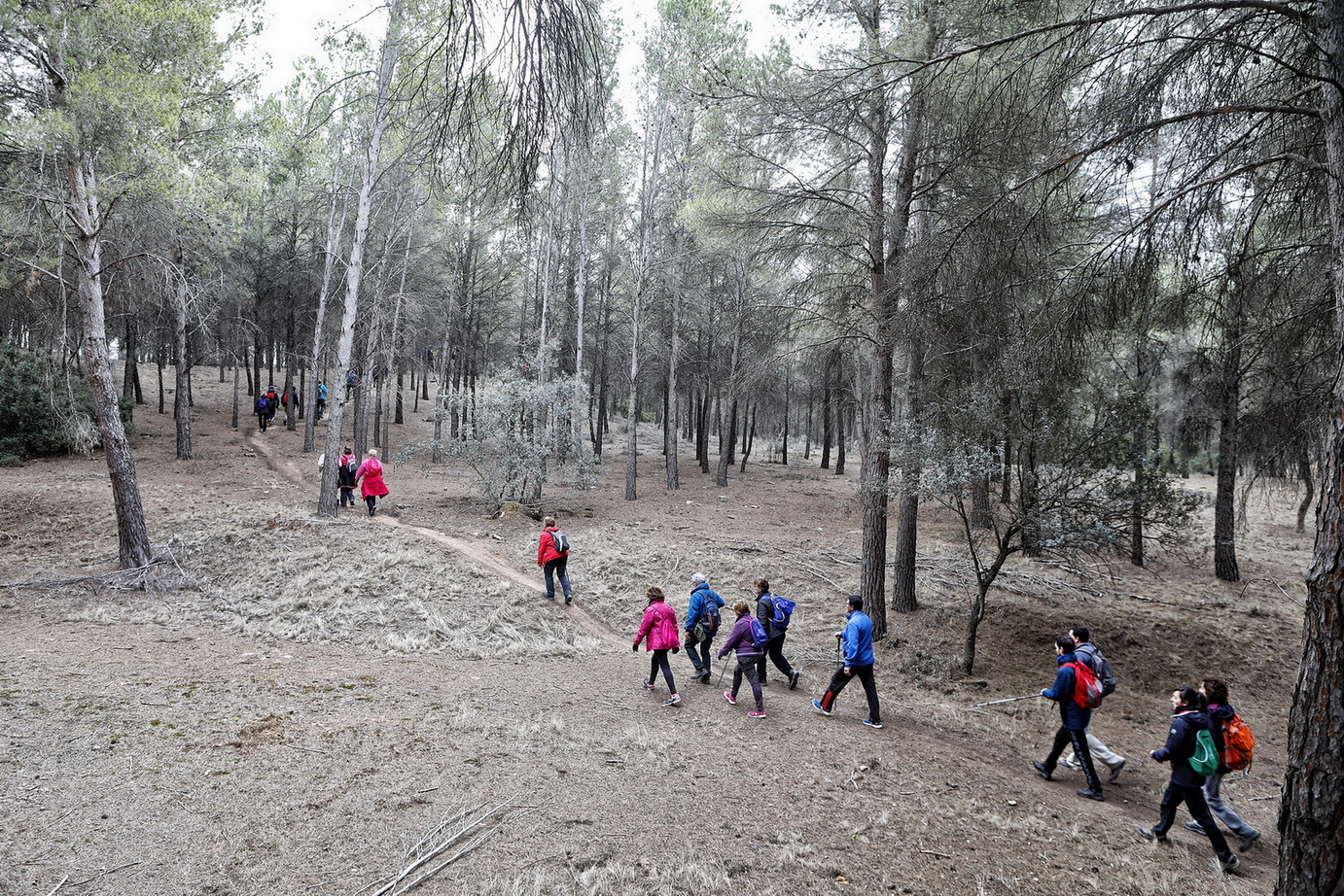 El cielo estaba cubierto y al llegar al municipio caía una fina lluvia que duró poco. Ya se podía ver el verdor en los grades bancales de este llano que andaban recorriendo, con el fondo de los pinos de la zona de la Dehesa en la cual se adentrarían, andaría entre ellos algunos kilómetros hasta llegar a las laderas vertientes al valle en el cual domina un mosaico de cultivos de secano mezclado con importantes rodales de bosque de Pino piñonero, Pino carrasco, Encina, Enebro, Sabina negral y especies como el Tomillo o el Romero.
