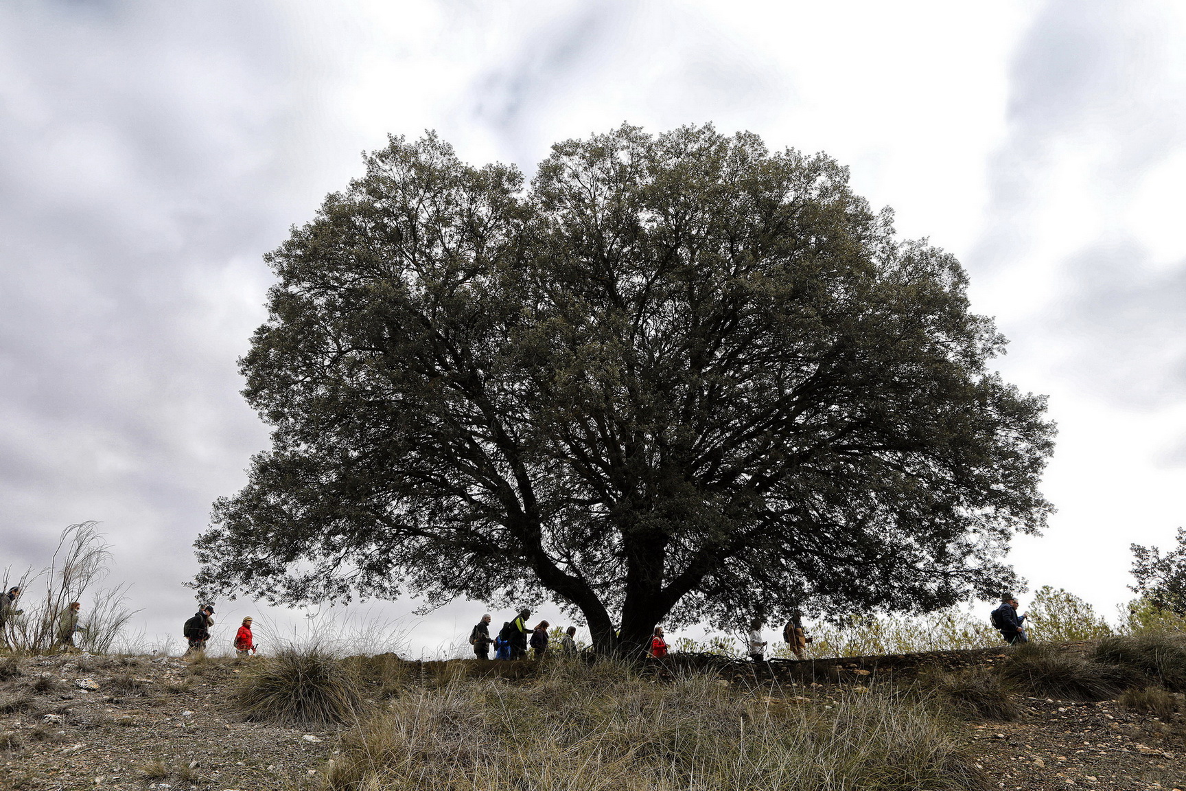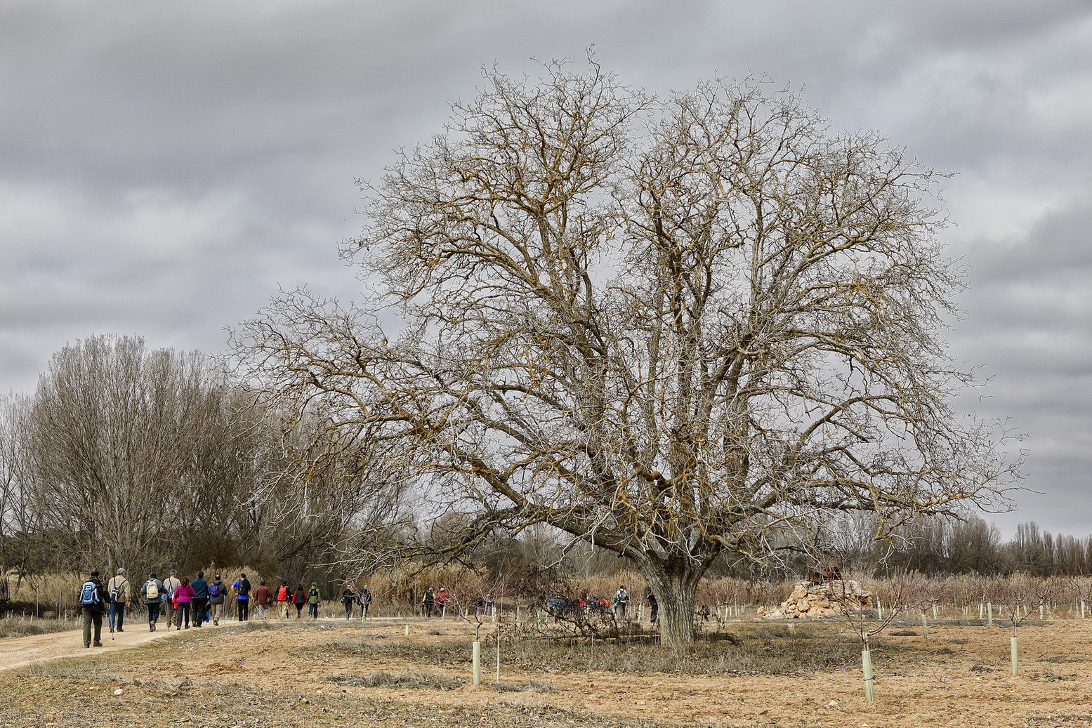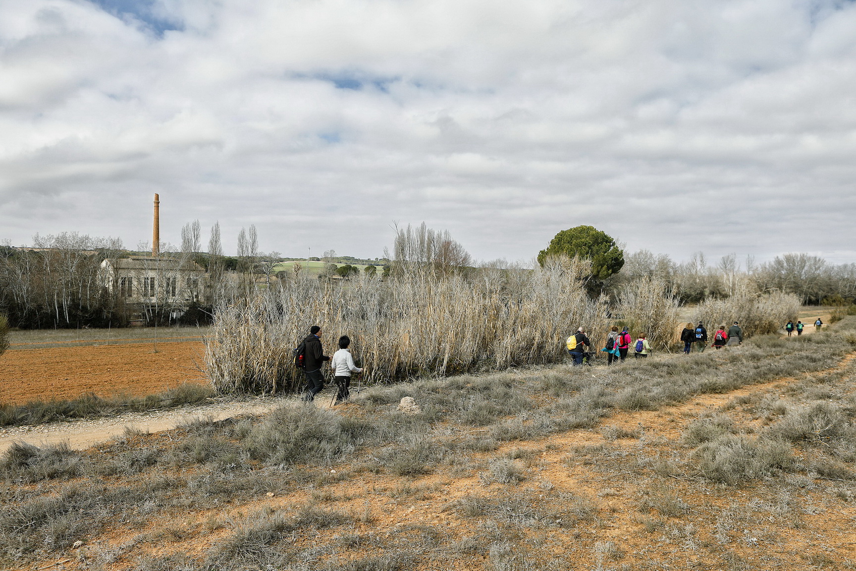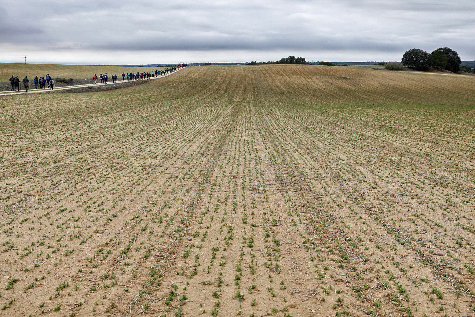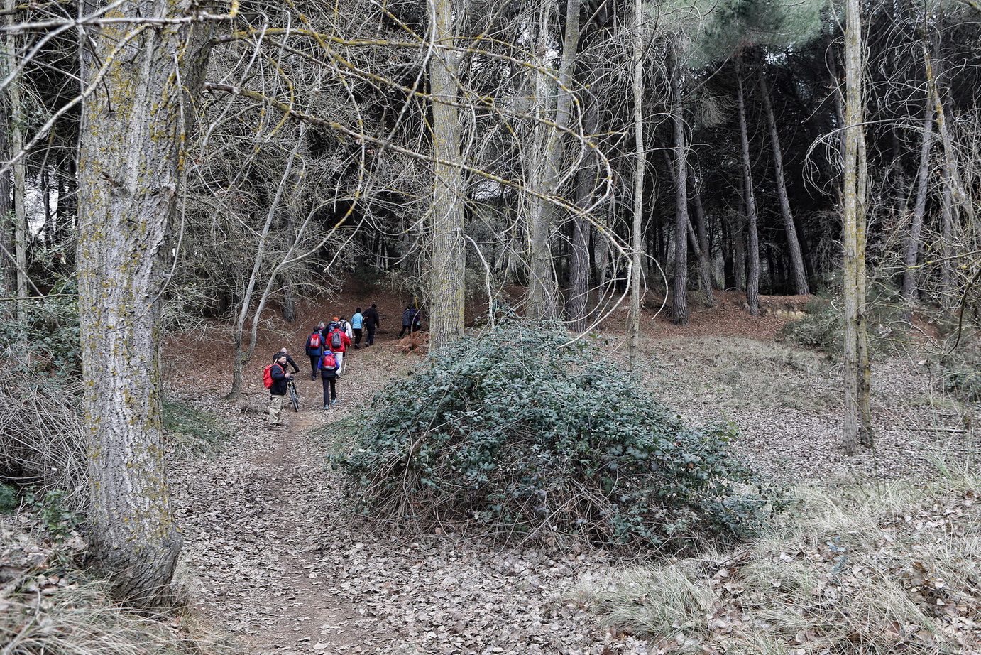 El cielo estaba cubierto y al llegar al municipio caía una fina lluvia que duró poco. Ya se podía ver el verdor en los grades bancales de este llano que andaban recorriendo, con el fondo de los pinos de la zona de la Dehesa en la cual se adentrarían, andaría entre ellos algunos kilómetros hasta llegar a las laderas vertientes al valle en el cual domina un mosaico de cultivos de secano mezclado con importantes rodales de bosque de Pino piñonero, Pino carrasco, Encina, Enebro, Sabina negral y especies como el Tomillo o el Romero.