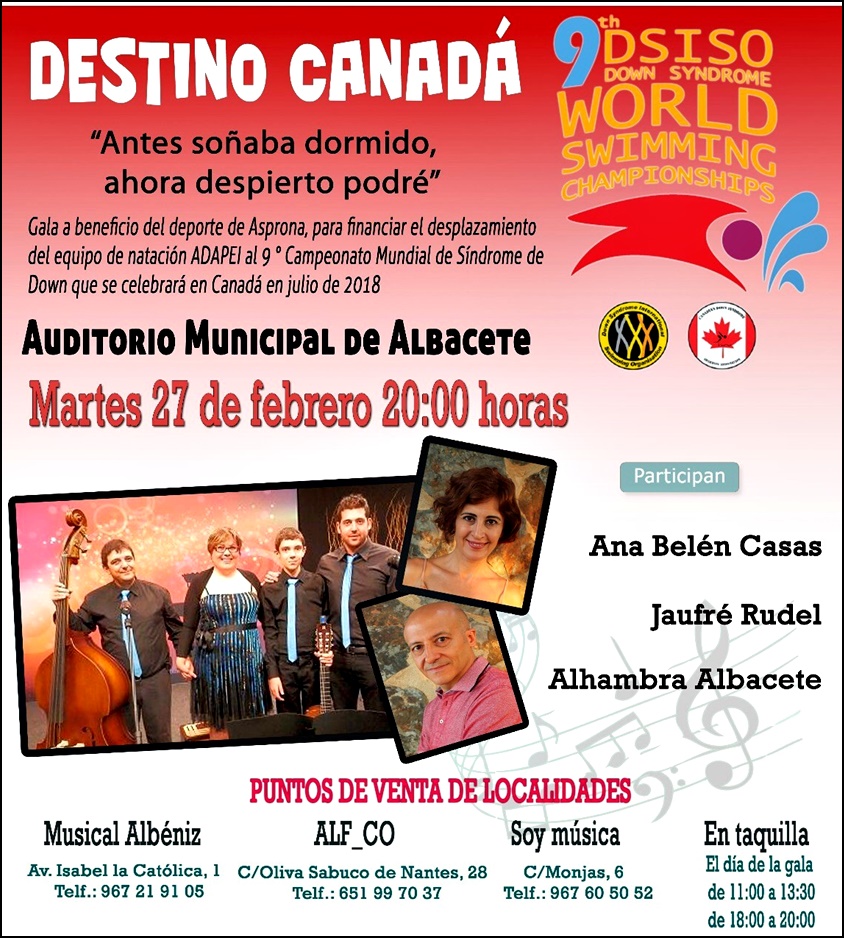 Este martes día 27 de febrero, a las 20:00 horas, se celebrará una Gala benéfica en el Auditorio Municipal llamada “Destino Canadá” con el objetivo de apoyar a siete deportistas albaceteños pertenecientes a ASPRONA en su mayor sueño: participar en el próximo mundial de natación que se celebrará en julio en Canadá.
