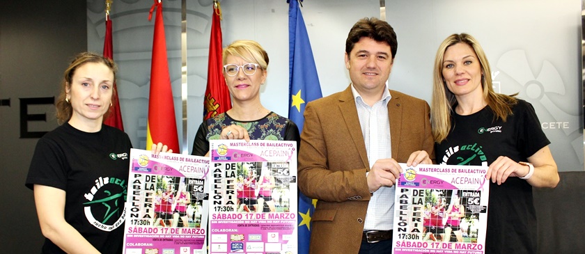 El concejal de Deportes del Ayuntamiento de Albacete, Francisco Navarro, junto a la presidenta de Acepain, Joaquina Alarcón y representantes de un gimnasio de nuestra capital, han presentado en la mañana de este lunes una Materclass de Baileactivo que tendrá lugar el próximo sábado 17 de marzo, a partir de las 17:30 horas, en el Pabellón de la Feria de la capital y que se hace a beneficio de la Asociación Costuras en la Piel en apoyo al paciente oncológico y la Unidad de Investigación de Cáncer del Complejo Hospitalario Universitario de Albacete (Acepain).