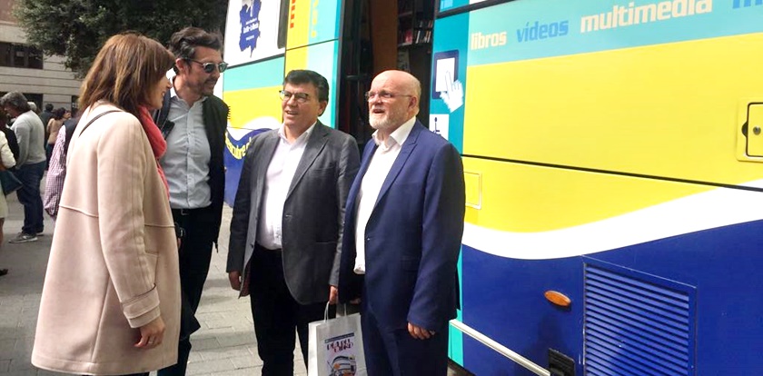 El delegado de la Junta en Albacete, Pedro Antonio Ruiz Santos, y el director provincial de Educación, Cultura y Deporte, Diego Pérez han recorrido los 17 stands instalados en el centro de la ciudad, y han valorado el papel que desempeña el Bibliobús para acercar la lectura a las zonas rurales.