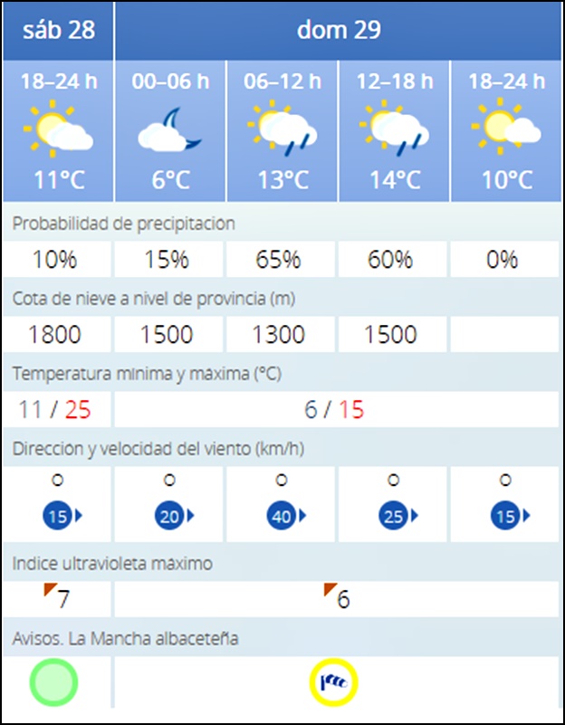 Además, en Albacete capital también podría haber chubascos localmente fuertes entre las 06:00 horas y las 18:00.