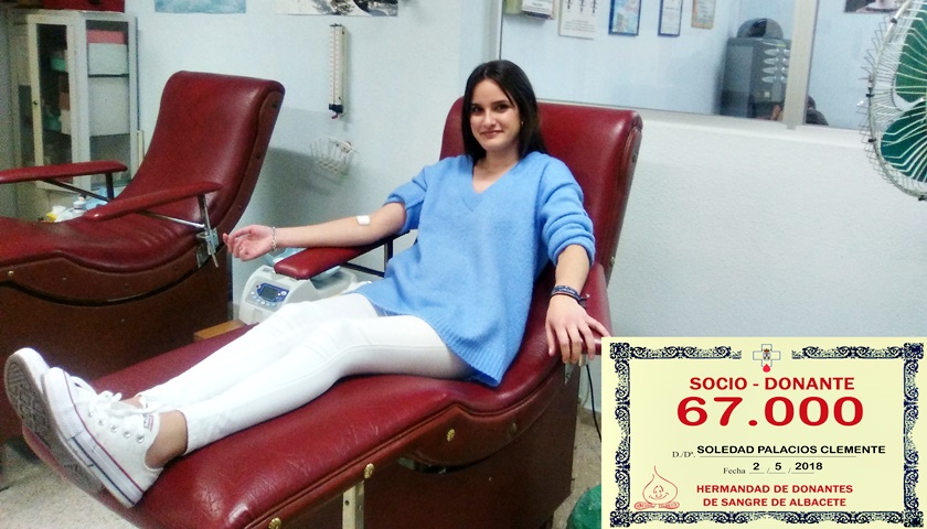 En la tarde de ayer, Soledad Palacios Clemente se convirtió en la Socio-Donante número 67.000 inscrita en los registros de la Asociación ‘Hermandad de Donantes de Sangre de Albacete’ al efectuar su primera donación en el Centro de Transfusión.