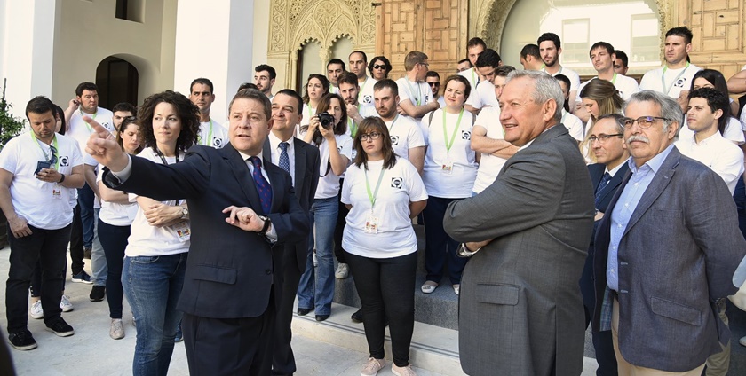 El presidente de Castilla-La Mancha, Emiliano García-Page, acompañado por el consejero de Agricultura, Medio Ambiente y Desarrollo Rural, Francisco Martínez Arroyo, ha recibido esta mañana en el Palacio de Fuensalida a medio centenar de jóvenes que desde este lunes están participando en la segunda edición del Campus Jóvenes Cooperativistas de Castilla-La Mancha, organizado por Cooperativas Agro-alimentarias con la colaboración de la Fundación Obra Social La Caixa.