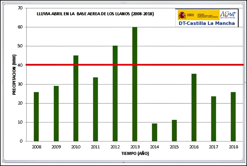 Y es que, abril ha sido seco en la Base Aérea de Albacete, obteniendo un total de 25,8 mm de agua, lo que supone la mitad de lo normal. Cifras que evidencian que “no se ha terminado la sequía, al menos en nuestra provincia”, incidía García, apuntando que ésta es una situación que se ha cronificado y que se evidencia en el gráfico que la analista predictora elaboraba para El Digital de Albacete, donde en la última década se aprecia que el valor normal, 40 mm, sólo se ha superado en tres de estos 10 años, siendo 2018 ligeramente más lluvioso que 2017.