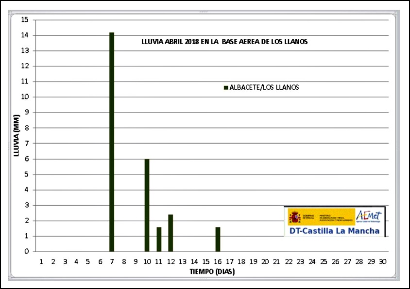 Pese a las predicciones de lluvia y los días nubosos, únicamente se registraron cinco días de lluvia en Albacete durante el mes de abril de 2018, produciéndose cuatro de ellos en la primera quincena y solo uno en la segunda. De estas jornadas lluviosas, cabe destacar que la cantidad máxima de lluvia por día apenas superó los 14mm, nos explicaba la analista predictora de la AEMET en la Base Aérea de Albacete, María García.