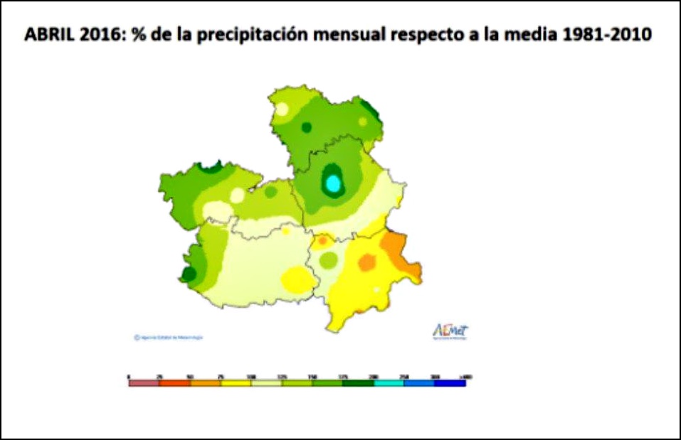De los últimos diez años, 2018 cuenta con seis años más lluviosos que él y solo con tres meses de abril menos lluviosos, lo que hace del mes pasado el cuarto menos lluvioso en la última década. Por el contrario, este año sí ha sido muy húmedo en Cuenca, con 89,8 mm, y en Guadalajara, con 83,3 mm; también ha sido húmedo en Toledo, 47,6 mm, y en Molina de Aragón, con 73,6 mm.