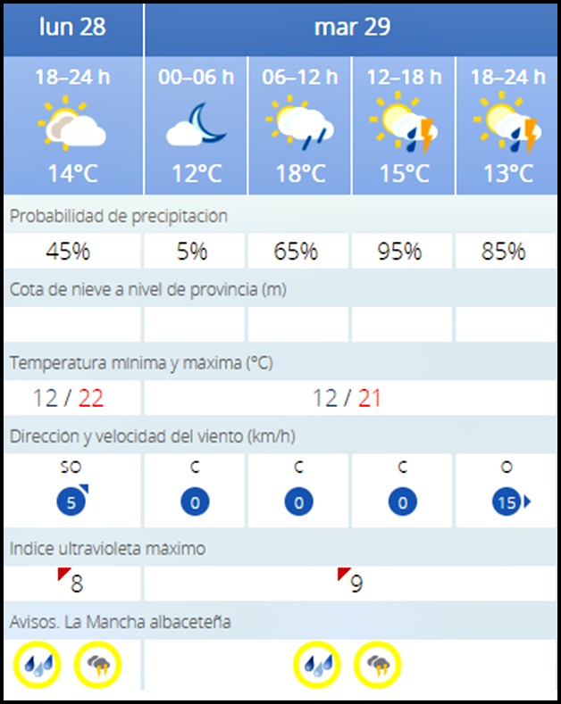 En Albacete capital, las previsiones de la AEMET indican lo siguiente: