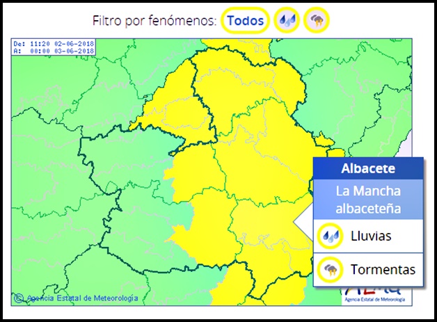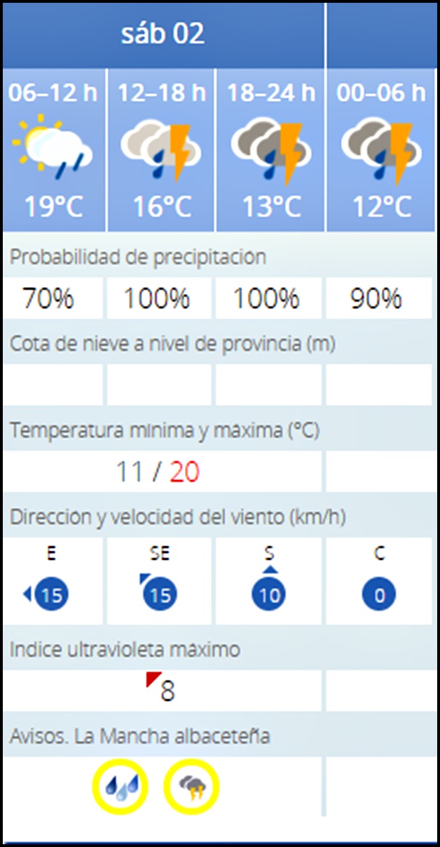 Según las previsiones de la AEMET las complicaciones comenzarían en Albacete capital a partir de las 12:00 horas de este sábado y se prolongarían hasta las 06:00 del domingo, con unos porcentajes de probabilidad tan elevados que parece muy difícil que las tormentas no hagan acto de presencia y descarguen con fuerza gran cantidad de agua, que por momentos podría ir acompañada de granizo.