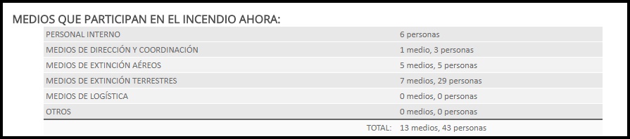 Del mismo modo, desde FIDAS argumentan que la información del mapa forestal es bosque, con un 90% de ejemplares de Quercus Ilex. Trabajan ahora mismo en la zona (19:00 horas) 6 personas de personal interno, 1 medio de coordinación con 3 personas, 5 medios aéreos y 7 terrestres, ayudados ambos de un total de 34 personas.