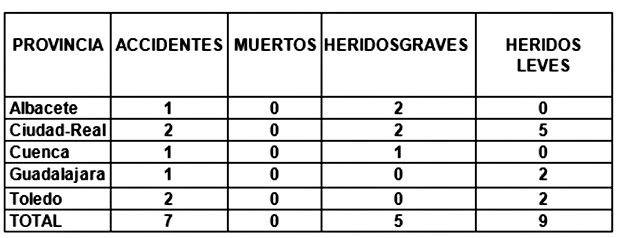 Concretamente, en la provincia de Albacete ha habido un accidente con dos heridos graves, mientras que en la de Ciudad Real se han registrado dos, con dos heridos graves y cinco leves, y en la de Cuenca ha habido un siniestro con un herido grave.