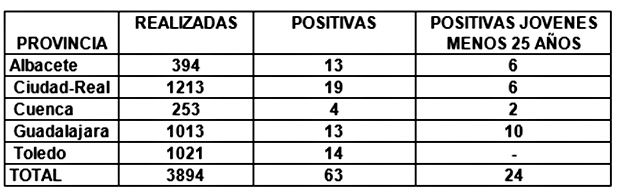 En Albacete se llevaron a cabo 394 pruebas de alcoholemia, 13 de ellas positivas, de las cuales seis son en menores de 25 años; en Ciudad Real fueron 1.213, 19 de ellas positivas, seis en menores de 25 años; y en Cuenca se realizaron 253 pruebas, resultando cuatro positivas y de éstas dos en menores de 25 años.