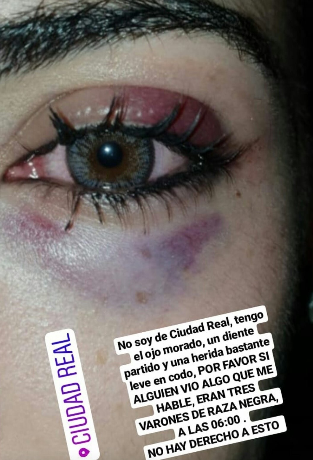 Asimismo, la Policía Local ha compartido en Twitter una foto de la propia víctima en la que se aprecia la confusión en el ojo y en la que explica que no es de Ciudad Real, por lo que solicita ayuda si alguien vio algo de la presunta agresión que se ha saldado con contusiones en un ojos, rotura de un diente y varias erosiones.