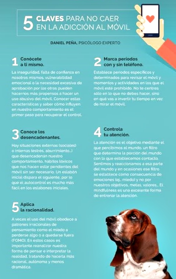 El doctor en Psicología y Ciencias de la Conducta y experto en adicciones a las nuevas tecnologías, Daniel Peña, explica que «el uso abusivo del teléfono móvil es una especie de ‘ladrón’ silencioso y astuto. Casi sin darnos cuenta nos roba tiempo, energía y atención, limitando así nuestra experiencia, empobreciendo nuestras relaciones personales y haciéndonos menos eficaces en la consecución de nuestros objetivos. Las consecuencias de este ‘robo’ pueden ir desde una leve, aunque inquietante sensación de insatisfacción vital, hasta severos problemas emocionales y de salud».