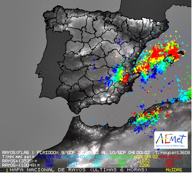 Además de la gran cantidad de agua, también fue elevado el número de rayos descargados sobre la capital y la provincia, alcanzando su punto máximo de concentración entre las 03:00 y las 05:00 horas como se puede apreciar en el siguiente modelo de la AEMET.