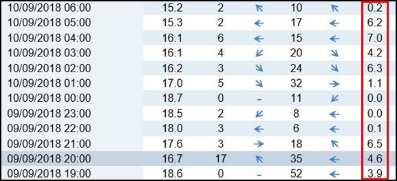 El punto más alto de precipitaciones se ha originado esta madrugada, a las 4:00 horas de este lunes, con una precipitación de 7 litros por medio cuadrado. Otros de los puntos álgidos de la jornada fue el tramo comprendido entre las 20:00 y las 21:00 horas, donde se recogieron 6’5 litros por metro cuadrado. Le siguen los tramos entre las 01:00 y las 02:00 y entre las 04:00 y las 05:00, con 6’3 y 6’2 litros recogidos respectivamente.